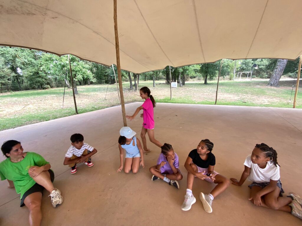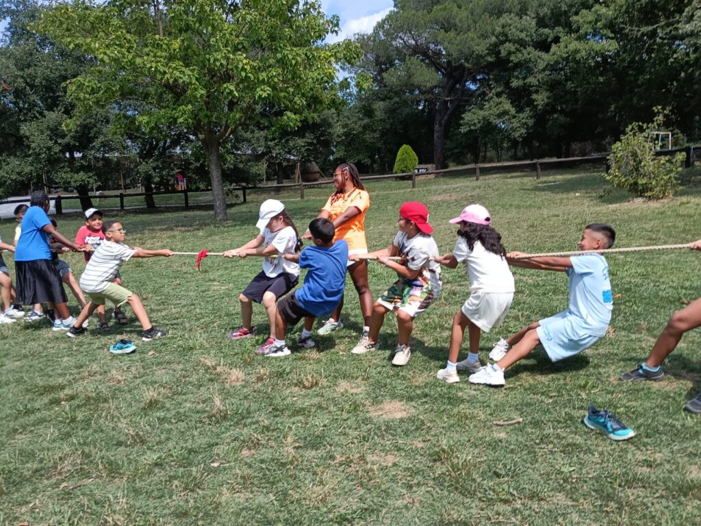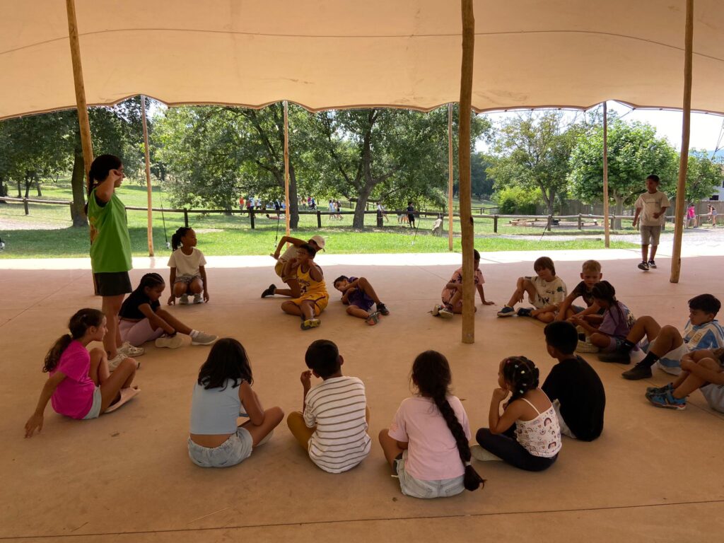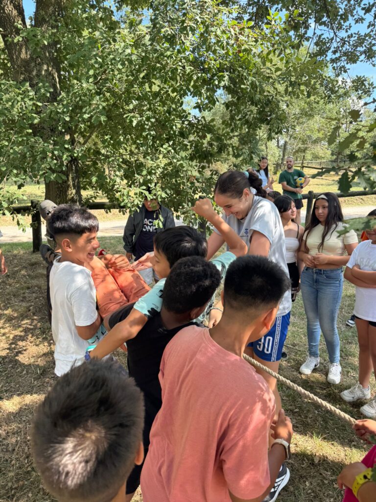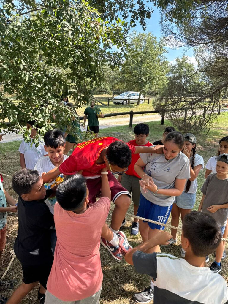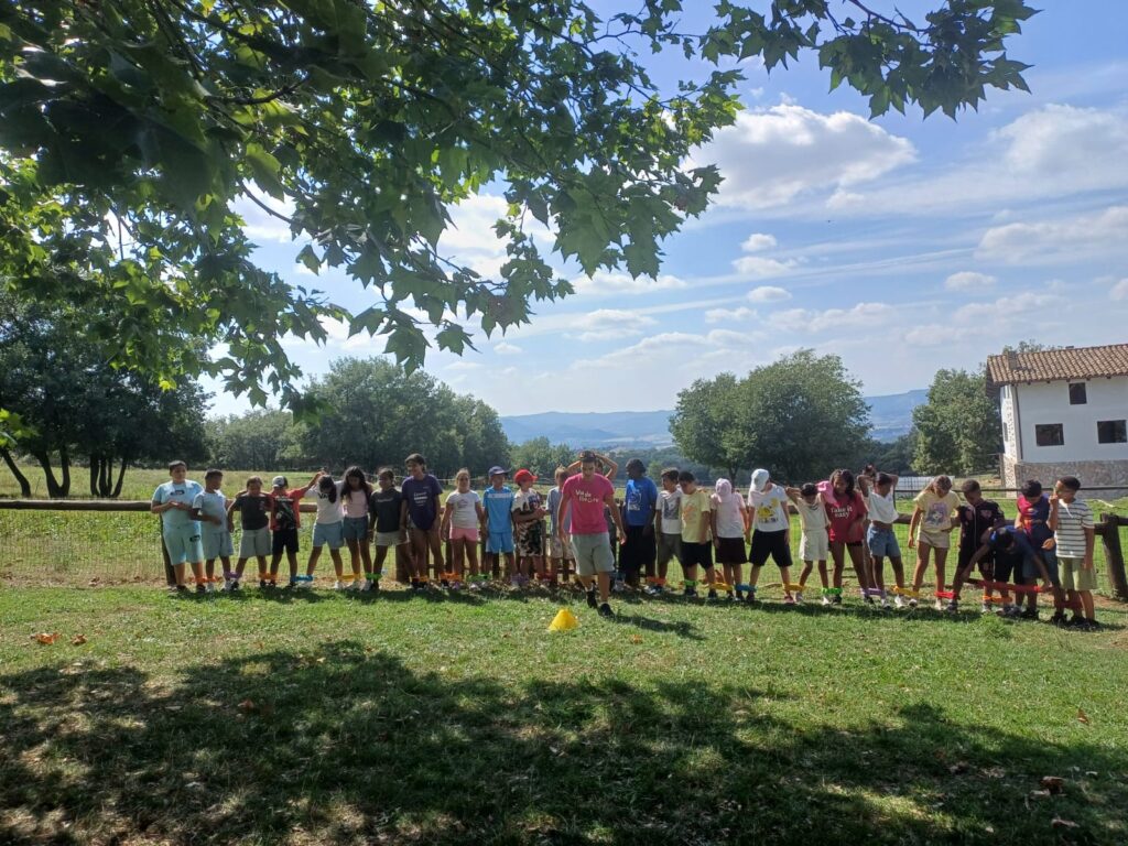 - Una vez instalados, realizamos una primera dinámica de juegos de presentación. El objetivo era empezar a crear vínculos entre los monitores y los niños, romper el hielo y construir ese ambiente de confianza y convivencia que queremos fomentar durante toda la estancia.
