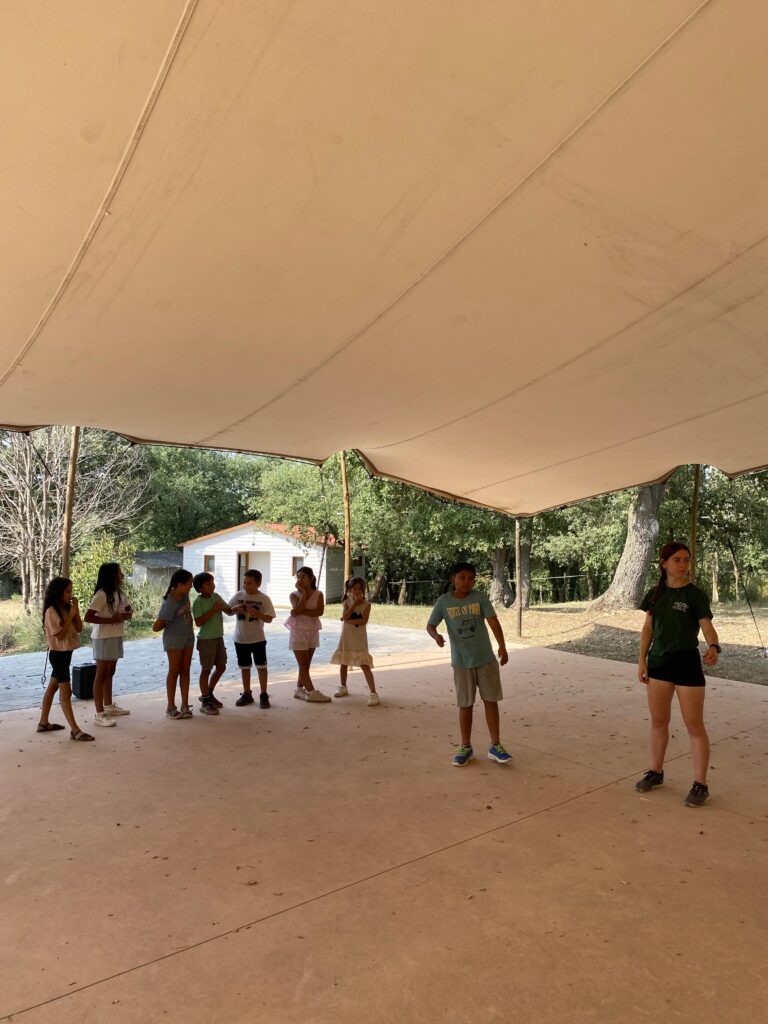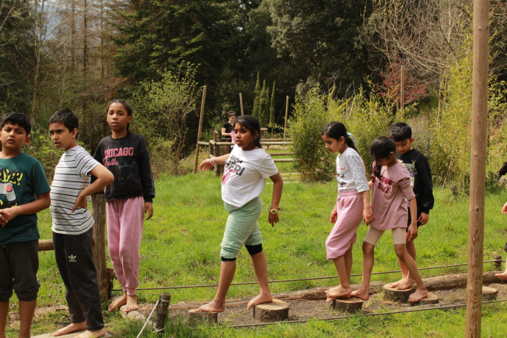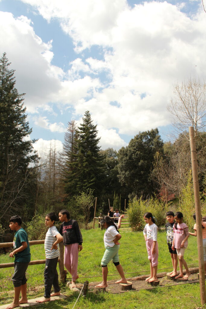 - Una vez instalados, realizamos una primera dinámica de juegos de presentación. El objetivo era empezar a crear vínculos entre los monitores y los niños, romper el hielo y construir ese ambiente de confianza y convivencia que queremos fomentar durante toda la estancia.